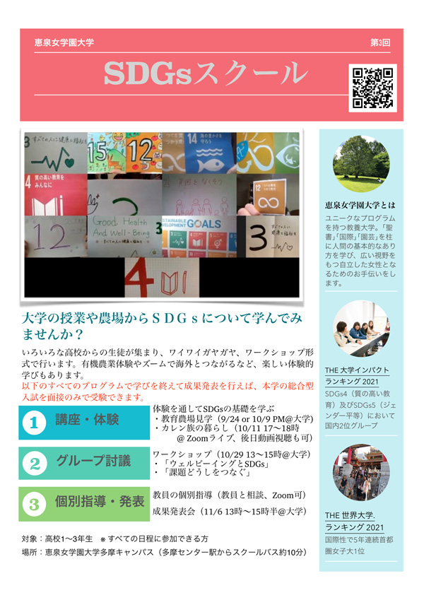 | 場所 | 恵泉女学園大学多摩キャンパス 多摩センター駅からスクールバスで約10分 |