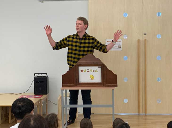カナダ出身の英語教師のニックさんは、KPKAダンデーズのメンバーとして、紙芝居シアターに英語紙芝居で参加してくださっています。