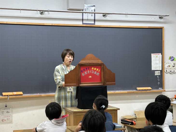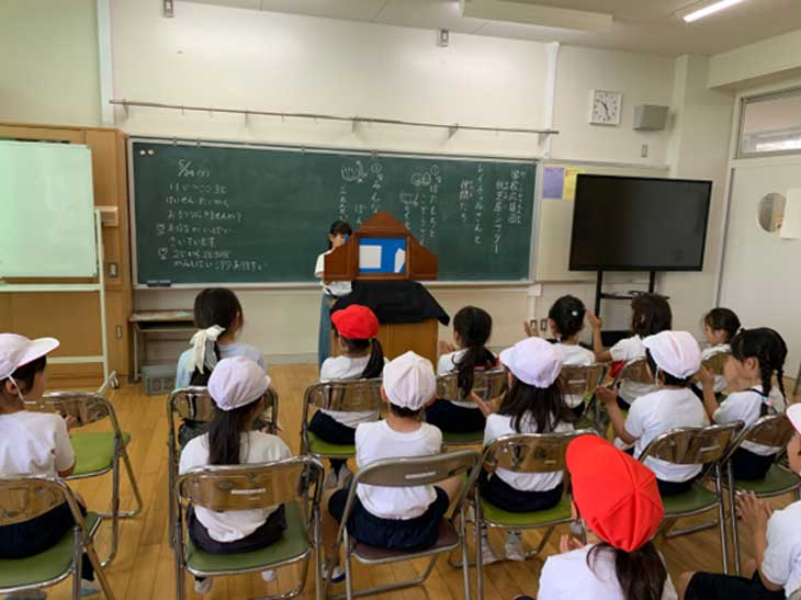 5/16金 多摩市立第二小学校での朝の紙芝居シアター
