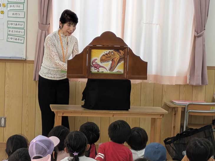 私たちが入室すると、床に座って見る子どもたちが紙芝居テーブル近くに三列にもなり、椅子席の前には男の子が大勢集まって開演を待ってくれました。演目は『みんなでぽん!』『がんばれ きょうりゅうぼうや』『おおきくおおきくおおきくなあれ』の3本。反応が良く、元気いっぱいの子どもたちのおかげで、愉快なひと時を過ごすことができました。