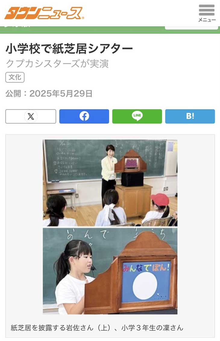 5/29 木 タウンニュース多摩版に「小学校で紙芝居シアター〜クプカシスターズが実演〜」と題した記事が掲載されました。