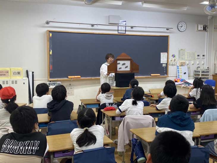 4名のクプカシスターズが朝8時に小学校に集合。4年生の2クラスに二人ずつに分かれて『みんなでぽん!』と『ぼたもちとこぞうさん』を実演しました。
