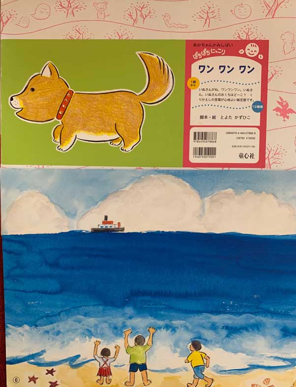 担当図書館員のOさんが、5組の親子さんの前で「だるまさんだるまさん にらめっこしましょ」と歌い始めると、泣いていた子もピタリと泣き止み、赤ちゃんたちはみんな集中。職場体験中の中学生2名も加わって、紙芝居シアターは「はじまるよはじまるよ」の手遊びから紙芝居『ワン ワン ワン』へ。