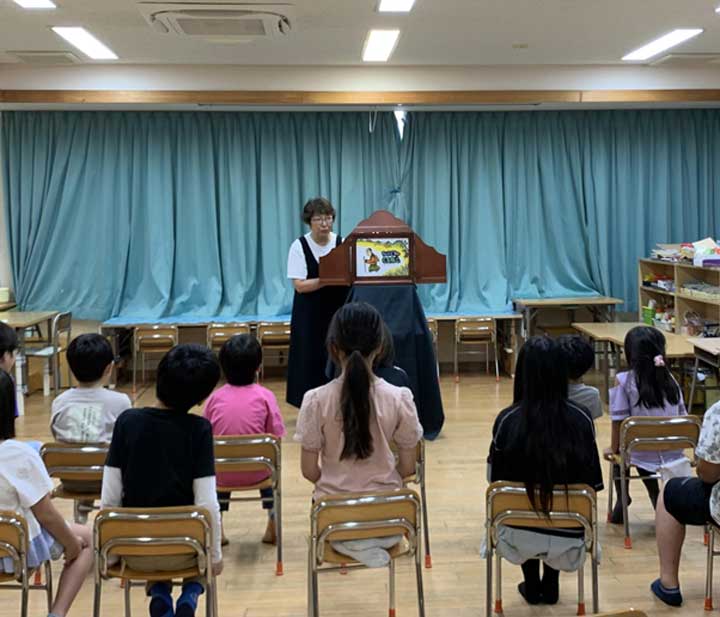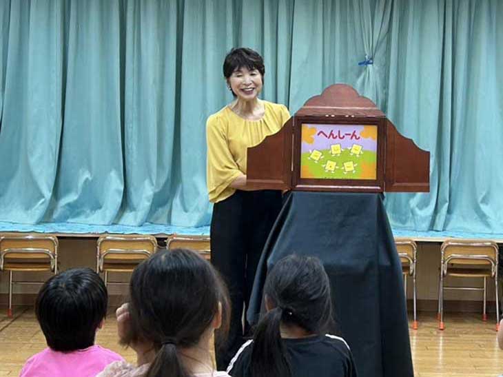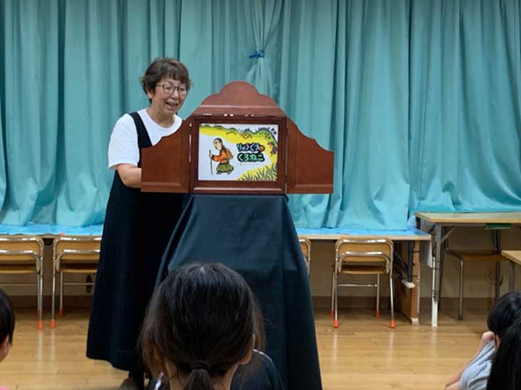 「読んでみたい人いますか〜」と呼びかけると、1.2年生からサッと手が上がり、5人の児童が一人2枚ずつ順番に読みました。学童の先生が紙芝居舞台のそばに付き添ってサポートしてくださり、そのおかげで子どもたちは安心して実演に集中。