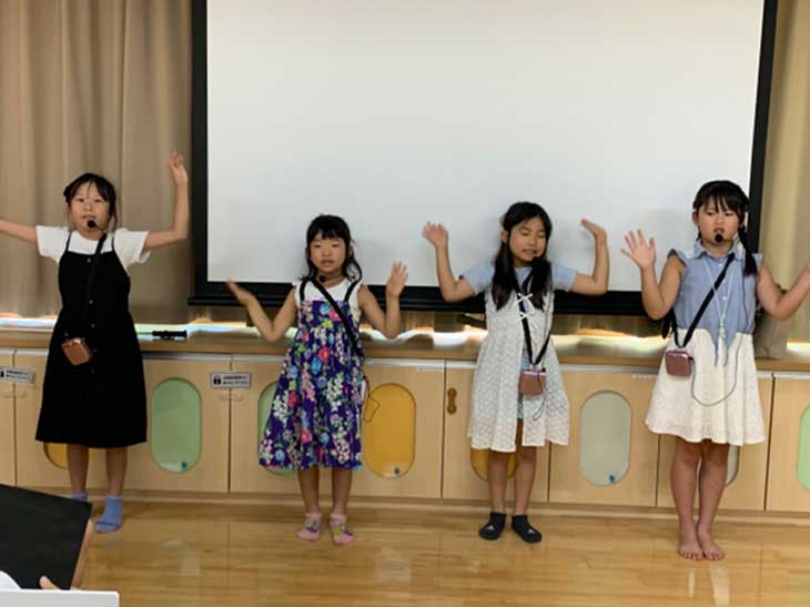 まずはいつもの手遊び歌「はじまるよ はじまるよ」からです。KPKAキッズが舞台中央でリードします。