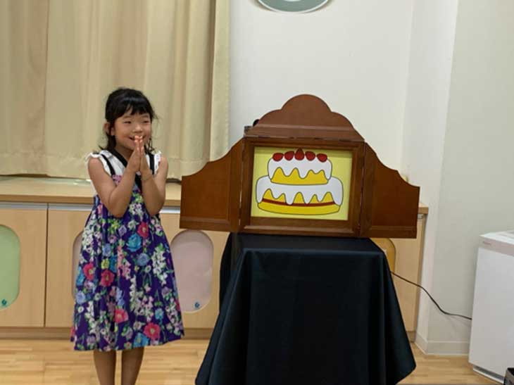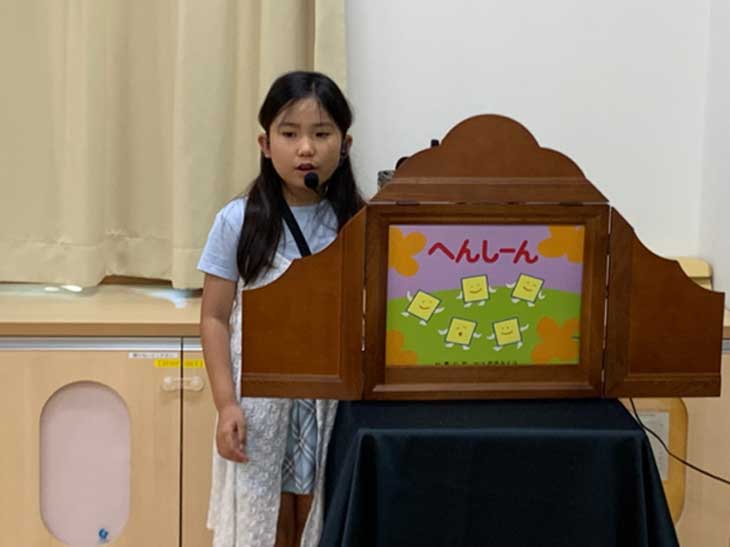 次に『大きく大きくおおきくなあれ』(作・絵 まついのりこ)を1年生のAさんが、最後に『へんしーん』を2年生のHさんが次々と演じると、会場は明るい笑顔と拍手に包まれました。