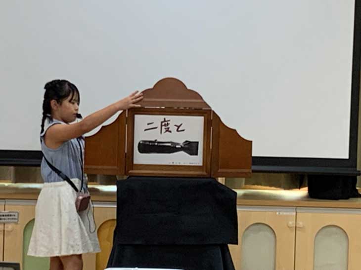 最後は、広島と長崎に投下された原子爆弾による被害の実相と未来への希望を描いた『二度と』(作・絵 松井エイコ)です。この作品は、去年から紙芝居の練習を重ね、様々な場所で実演経験を積んできた小学3年生のYさんによって実演されました。Yさんは紙芝居に登場する実在の人物「アヤ子」と同じ8才です。
