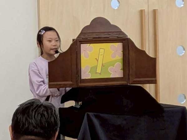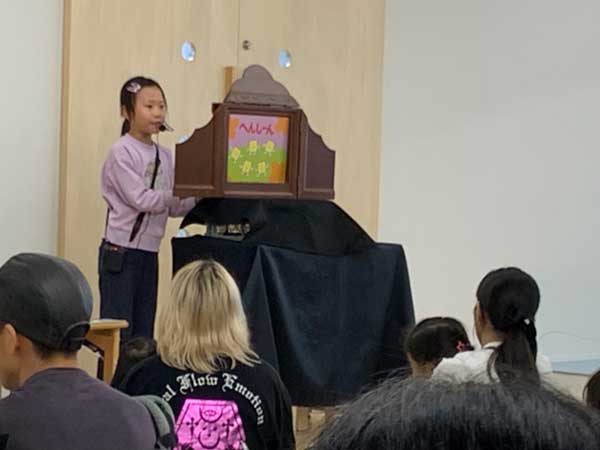 3番目は、今日がこどもひろばOLIVEデビュー、小学三年生のKさんです。元気にハキハキとした声で楽しそうに演じる姿は、とても初めてとは思えない落ち着きと安定感があります。終わった後は会場から大きな拍手が!