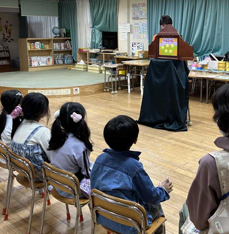 唐木田児童館での「赤ちゃんおはなし会」には5組の親子さんが集まってくださり、紙芝居を見るのは初めてのお子さんも興味深々で画面を見つめて参加してくれました。演目は『みんなでぽん!』『ぱん ぽこぽん』『おすわりやすいすどっせ』です。