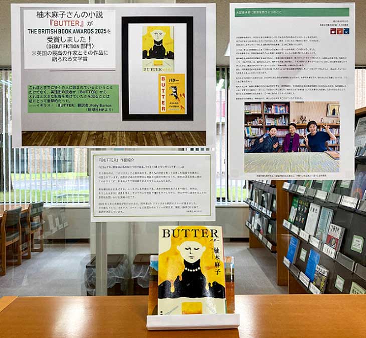 本学の図書館では、さっそく『BUTTER』の本と共に、過日の「学長の部屋」を展示する素敵なコーナーを作ってくれました。柚木さんのご活躍を大変嬉しく思いますと共に、この度のご受賞を心からお慶びいたします。