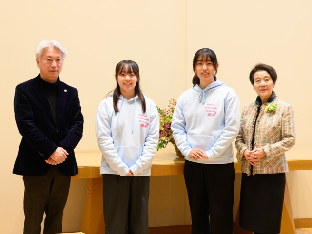 また、私たちは恵泉教育の三つの礎である「聖書・国際・園芸」を通し、キリスト教信仰に基づき、神と人とに仕え、自然を慈しみ、世界に心を開き、平和の実現のために私には何ができるかを学び、考えます。恵泉ではこの礎に基づいた、ここにしかない授業がたくさんあります。生涯就業力STEPの授業では、「恵泉で何を学ぶのか」「私らしさとは何か」「恵泉での学びは、卒業後の人生でどのように支え、導いてくれるのか」などについて自分に向き合いつつ考えを深め、「生涯にわたって自分らしく生きる目標を忘れず、身近な大切な人、地域・社会のために尽くして生き続ける力」を育みます。恵泉の先生方に限らず各界で活躍されている方や先輩、卒業生たちを講師に迎え、1ステップずつ社会へはばたく準備をします。さまざまな経歴の方々からお話を聞くことができて、新しい視点を得ることができたと感じています。このように授業や行事に精一杯取り組むことで、今後体験しようと思っても難しいことにも挑戦でき、この経験を活かすことで、誰かの役に立つ働きを担うことができるのだと思うのです。