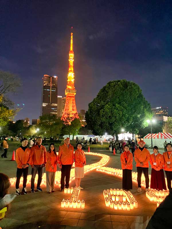 そして、夕暮れが迫ってきた17時から、区長も参加されて、メッセージキャンドルの点火が行われ、続いて、18時9分に、児童相談所虐待対応ダイヤル「189(いちはやく)」に合わせて、東京タワーオレンジリボンがライトアップされました。夕闇の中に浮かびあがった幻想的なオレンジ色を見つめながら、どうか子どもたちが幸せな時を過ごしてくれることを、そして、子育てをはじめとしてさまざまな苦しみを抱えている親が救われることを祈りました。