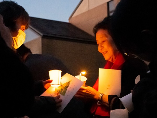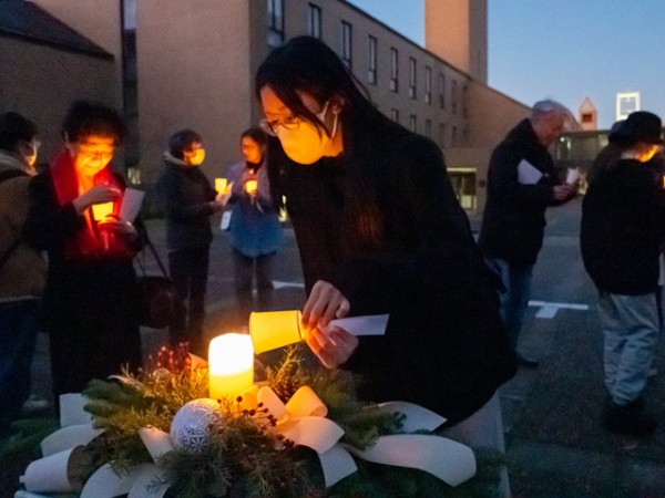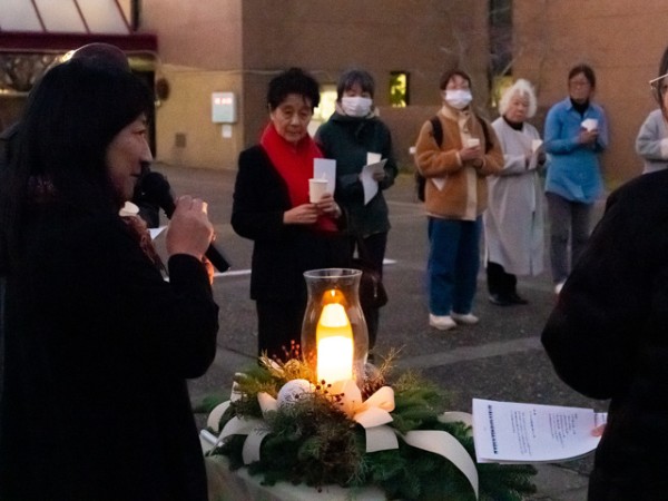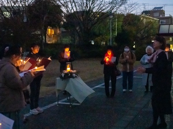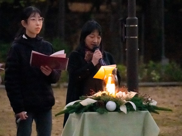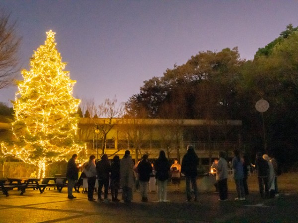 徐々に暗闇が深まるにつれて風も出てきて、キャンドルの火を灯し続けるのが少し大変でしたが、讃美歌 の賛美、待降の祈りが進む中、もみの木にあかりが灯された瞬間の美しさに寒さも忘れるひと時でした。