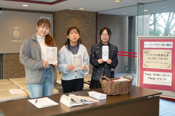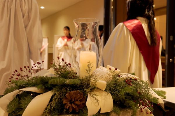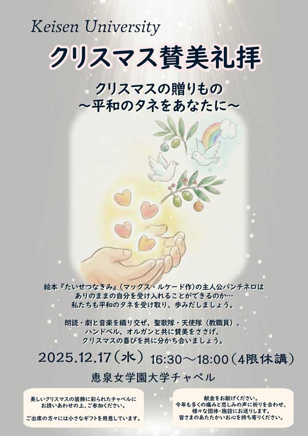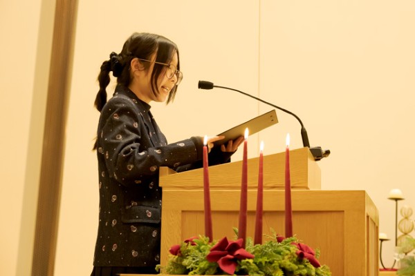 例年、学内者だけのプログラムでしたが、これまで参加のご希望をいただくことの多かった卒業生や公開講座受講生の方々など、恵泉女学園の関係者の皆様にも、人数に限りはありましたが、事前申し込みによりご参加をいただき、アドヴェントクランツに火が灯ってステキな装飾で彩られた多摩キャンパスのチャペルで、たくさんの皆様と共にクリスマスの喜びを分かち合いました。