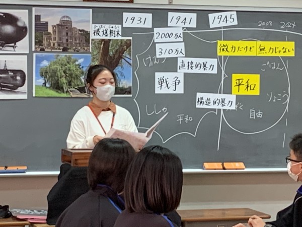 多摩市内中学校での平和学習を授業者としてリードする学生