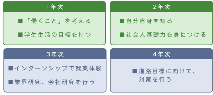 1年、2年を対象としたキャリアガイダンス。3年生、4年生を対象とした、業界研究、職種研究、面接講座、グループ面接練習などを実施しています。