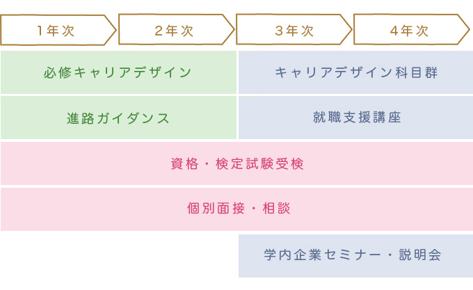 自立した女性の人材育成を目標に、入学時から卒業時までの、学生の総合的な支援体制を整えています。