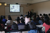 いつもは7クラスに分かれて開かれています歴史文化学科2年生のゼミですが、今日は合同特別授業となりました。場所も大教室に移して、特別講師をお呼びしました。歴史文化学科の前身となります文化学科を卒業して、現在は世界遺産アカデミーに勤務されている広田麻季さんです。
