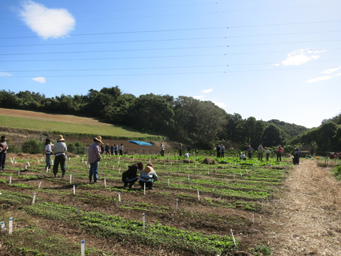 秋晴れの空のもと、「生活園芸Ⅰ」の授業では、学生たちの元気な声が畑に響き渡っています。
