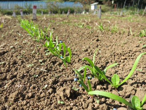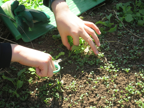 そして、根気のいる間引き。株と株との間隔を徐々に空け、野菜が成長できるスペースを作っていきます。まだ若い芽は優しく扱わないといけません。慎重にハサミで根本を切って間引きをします。