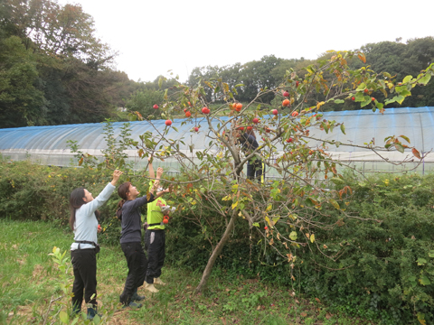 やはり食欲の秋!農場の一角に植えられた柿は、手が届く範囲はすでに収穫されています。みんなで協力して、高い場所に残っている実を必死にとっていました。がんばってとった柿、一段とおいしいことでしょう♪