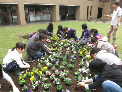 キャンパスの三日月花壇が「生活園芸Ⅱ」の授業で、パンジーに植え替えられました。これから寒くなり、花の少なくなる時期に華やかな花壇がキャンパスを明るく彩ります。 きれいに咲いてねと、願いを込めて・・・。