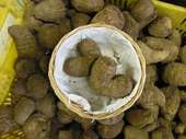 今年のサトイモは豊作でした。茎を鎌で切り、スコップでイモを掘り上げます。メキメキっと音がして出てきたイモの多さ、付き方にみんな驚きました。サトイモ畑はクラス毎の共同管理でしたが、みんなが協力し合って愛情を込めたからか、ハートの形をしたイモが出てきました。