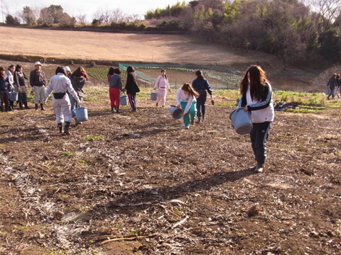 1月23日で授業が終わり、畑もだんだん寂しくなってきました。「生活園芸I」では、収穫し終わった畑にお礼肥をしました。秋に収穫したサトイモやムギワラギクの畑にも、感謝の気持ちを込めて、牛ふんやカキ殻(焼成有機石灰)を施します。