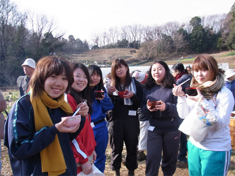 最後の授業では、ハクサイ、ダイコンを使ってお味噌汁を作り、作業が終わってから大きな鍋を皆で囲んで畑の恵みをいただきました。寒い中でのお味噌汁は体の芯まで温め、とても優しい味がしました。