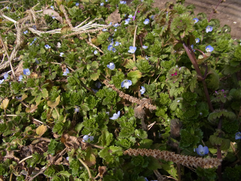 春休みに入って、教育農場に学生の姿が見られなくなりました。収穫時に取り除き、畑に置いておいたハクサイの外葉はカサカサになっています。小さかったホウレンソウは手のひら以上に大きくなり、葉を横に広げロゼット状になって寒さにじっと耐えています。 とても静かな畑・・・いえ、足下に目をやると、空色のオオイヌノフグリやピンク色のホトケノザの花がもう咲いているのです。モノトーンだった畑も、徐々にカラフルになってきました。学生の声は聞こえませんが、春の声はもう聞こえてきています。