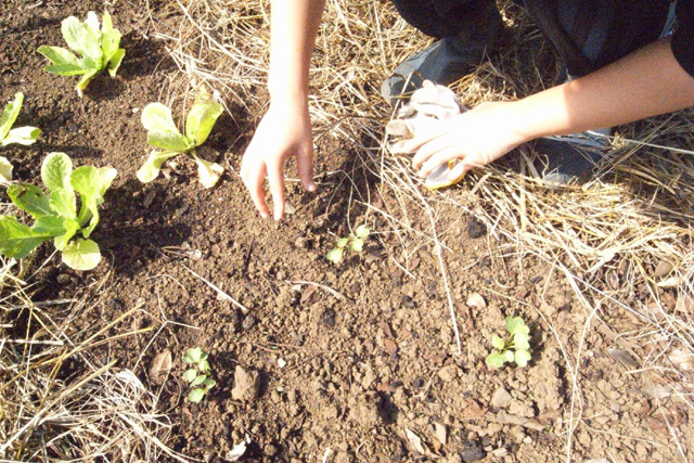 10月はじめには、コカブ、チンゲンサイ、ラディッシュ、サニーレタスの中から、各班3種類を選んで播きます。