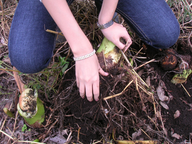 「生活園芸 I」のクラスごとの共同畑で栽培したサトイモが、今年は大漁でした。