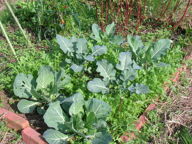 ブロッコリーが大きくなる前に、ミズナを収穫することができます。