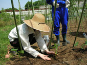 「生活園芸 I」では、連休明けにキュウリを植え付けました。近隣の農家の方が育てた苗で、授業の日に農協のご担当者の方とご一緒に、農場まで届けてくださいます。