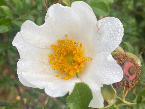 白い花弁と黄色の中心部分(雄しべ)のコントラストが美しく、実は赤茶色っぽい色が特徴です。