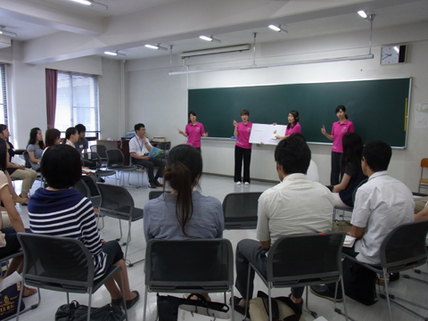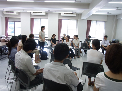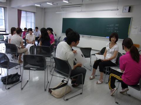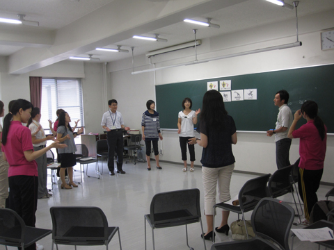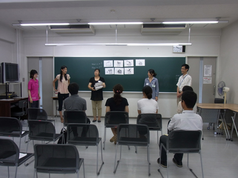 多摩市教育委員会からの要請を受け、本学において多摩市小学校の先生達約20名を 対象に、小学校外国語活動研修会を実施しました。恵泉英語教育研究会(KEES)が 2007年度より取り組んでいる、「ストーリを生かした英語の授業」の実践例を、KEES メンバー(本学学生)によって紹介。その後グループに分かれ、 "Dear Zoo"という 絵本のストーリーを中心に、チャンツ、歌、ゲーム、絵本の読み聞かせなどを分かれて 練習し、発表しました。