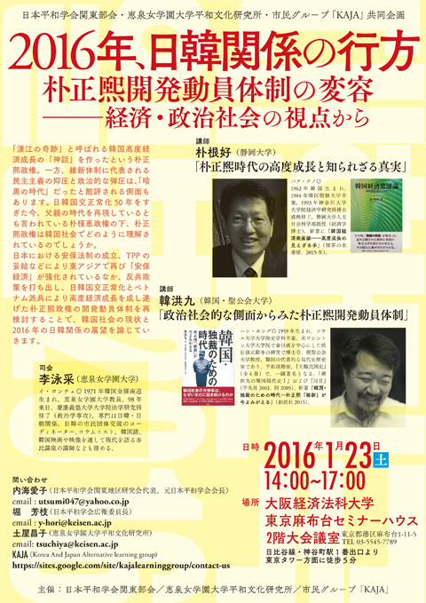 日本における安保法制の成立、TPPの妥結などにより、東アジアで再び「安保経済」が強化されているなか、反共政策を打ち出し、日韓国交正常化とベトナム派兵により高度経済成長を成し遂げた朴正煕政権の開発動員体制を再検討することで、韓国社会の現状と2016年の日韓関係の展望を論じていきます。