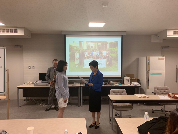 一人一人修了証を渡され、岩村先生のサックスフォンによるBGMが流れる中、大日向学長による送別の挨拶がありました。また澤登先生が用意した自家製の葡萄ジュースで乾杯をしながら一週間の恵泉と梨花の共同授業は幕を閉じました。