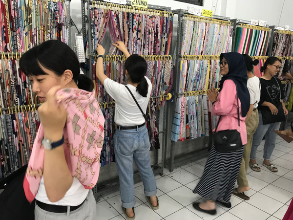 夕食後は、ジルバブのお店へ!値段は安いもので15.000~20.000ルピア(約150~200円)。色んな色、柄、素材のジルバブがあって、インドネシアの女子学生と一緒にみんなで選ぶのを楽しみました!