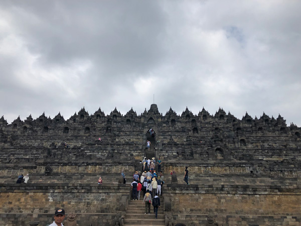世界遺産ボロブドゥール寺院は仏教のお寺です。ボロブドゥールを日本語に訳すと「山寺」。ボロが「お坊さん」、ブドゥールが「丘」を意味します。寺院の回路にある壁画に描かれた仏教説話を楽しみしながら登ります。1番上の回廊では、「健康」「心の安寧」「幸福」を願いながら時計回りに3回まわるそうです。