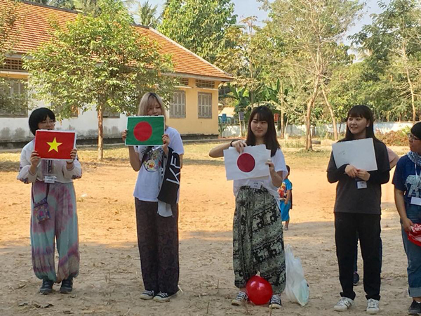 9時~11時の2時間という短い時間でしたが、子ども達に日本のことを少しだけ学んでもらいました。学校に着いたら子ども達が民踊と国家を歌って歓迎してくれたので、私達からは『きらきら星』を日本語とクメール語で歌いました。その後は日本についてのクイズをして、日本の国旗、日本の花、日本語を当ててもらうクイズをしました。当たった子には折り紙で作ったメダルを渡しました。とても喜んでくれました。