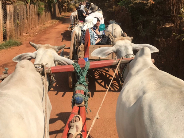 午後はサムロム村を訪問しました。のんびりと牛車に乗って村を散策しました。牛車は初体験だったので面白かったです。村のいろいろなところに行きましたが、ひとつにお寺があります。昔は寺子屋として使われていたそうですが、現在は食料に困っていたらお寺に行けばご飯をもらえたり、悩みをお坊さんに話すことが出来る村の救済施設の役割も果たしています。カンボジアの農村の雰囲気を味わえるとてもいい所でした。