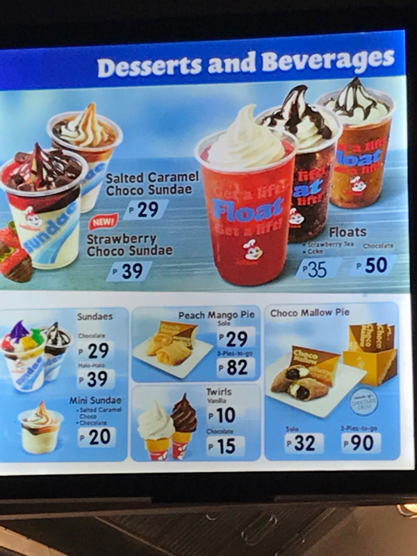 フィリピンで有名なファーストフード店のジョリビーのアイスのメニューです。日本でいうケンタッキーのようなお店で、毎日沢山の人で賑わっています。