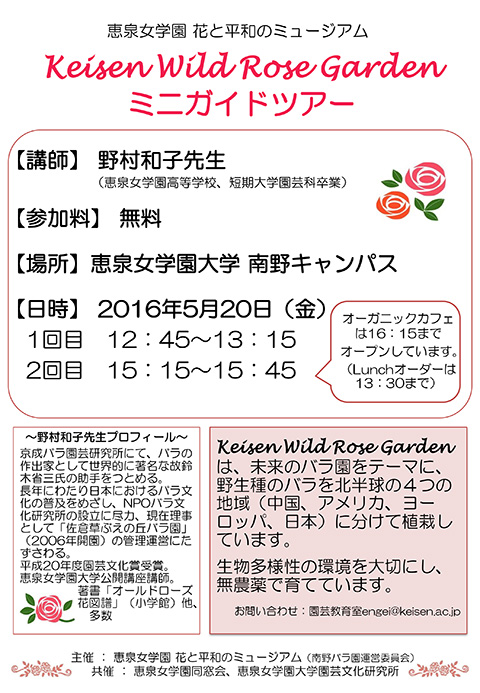 4年目を迎えた南野キャンパスのバラ園Keisen Wild Rose Gardenで、野村和子先生によるミニガードツアーを開催します。