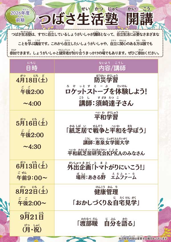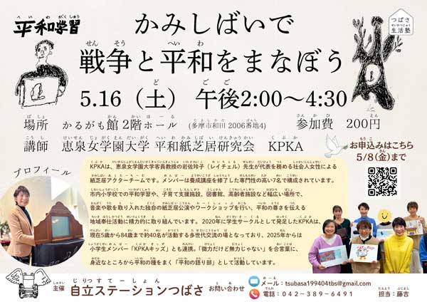 5月16日(土)の「つばさ生活塾」(主催:自立ステーションつばさ)にて、恵泉女学園大学 平和紙芝居研究会 KPKA(クプカ)が平和学習の講師をつとめます。