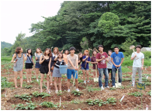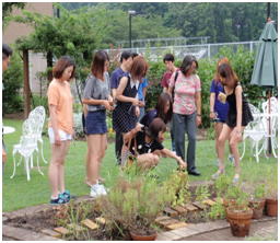 キャンパスツアーや恵泉の特色ある学部学科の紹介の後に、FSの説明や園芸の体験を行なってもらいました。FSの説明では海外体験を行った学生2名の説明に質問が続くなど熱い反応がありました。そして、畑へ行き、取れたてのきゅうりを食べたり、土を耕したり、日本の大学でもめったに体験できない経験をしていただけたと思います。韓信大学の学生達も畑での作業は初めてのようで、楽しかったととても喜んでおられました。