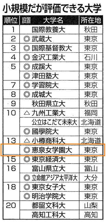 「小規模だが評価できる大学」という項目で、恵泉女学園大学は第13位(女子大学では第2位)にランクインしています。