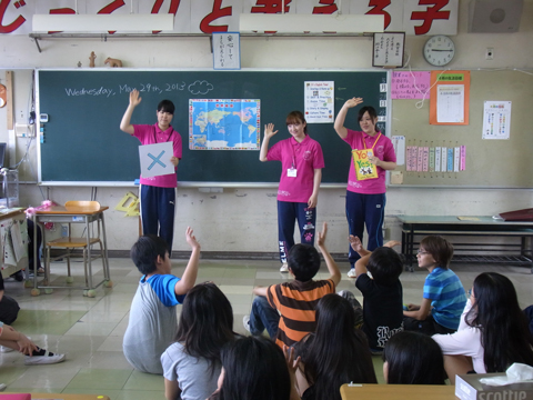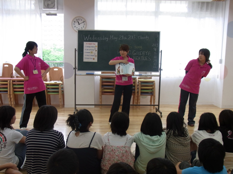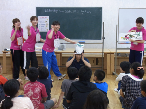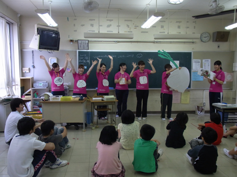 英語教員を目指す学生から成る「恵泉英語教育研究会(Keisen English Education Society = KEES)」のメンバーが、5月29日(水)と6月29日(水)に多摩市西愛宕小学校・豊ヶ丘小学校の5年生・6年生クラスを訪問し、担任の先生のご協力を仰ぎながら外国語活動の実践を行いました。KEESでは、2007年より小学校における絵本を生かした英語授業に取り組んでいます。5月29日の活動では "Yo! Yes?" (by Chris Raschka)、6月29日の活動では "Gigantic Turnip" (A Tolstoy's Russian Folktale) の絵本を題材にして、ゲーム、歌、スキット、絵本の読み聞かせなどさまざまな言語活動を行い、英語の楽しさや、絵本の豊かさを児童に伝えました。
