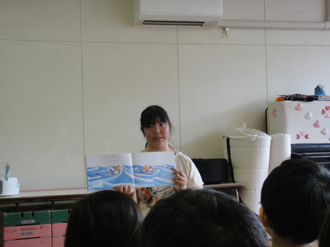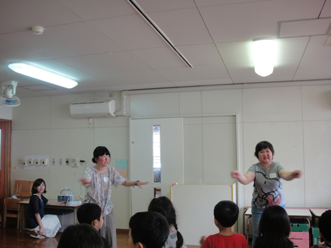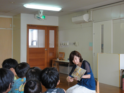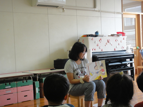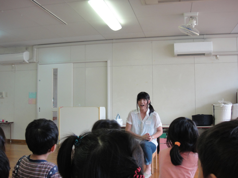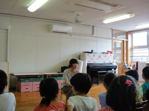 おはなしの好きな学生から成る恵泉お話を語る会(恵話会)のメンバー8名が、7月30日(火)に多摩市内にあるこころ保育園でおはなし会を10時より行いました。対象は年中のきりん組(29名)、年長のこころ組(29名)の園児たちです。「夏」をテーマに、語り、絵本、紙芝居、歌、盆踊りなどをそれぞれの組で30分程度行いました。学生たちは、先生方のお手伝いを得ながら、おはなしを楽しく届けることができました。