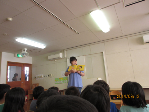 1.『ガンピーさんのふなあそび』ジョン・バーニンガム・作 みつよし なつや・訳 2.『ねこのはなびや』渡辺 有一・作 3. 歌「虫のこえ」振り付けあり 4.『バムとケロのそらのたび』島田 ゆか・作 5.『さつまのおいも』中川 ひろたか・文 村上 康成・絵 6.手遊び「やきいもグー チー パー」